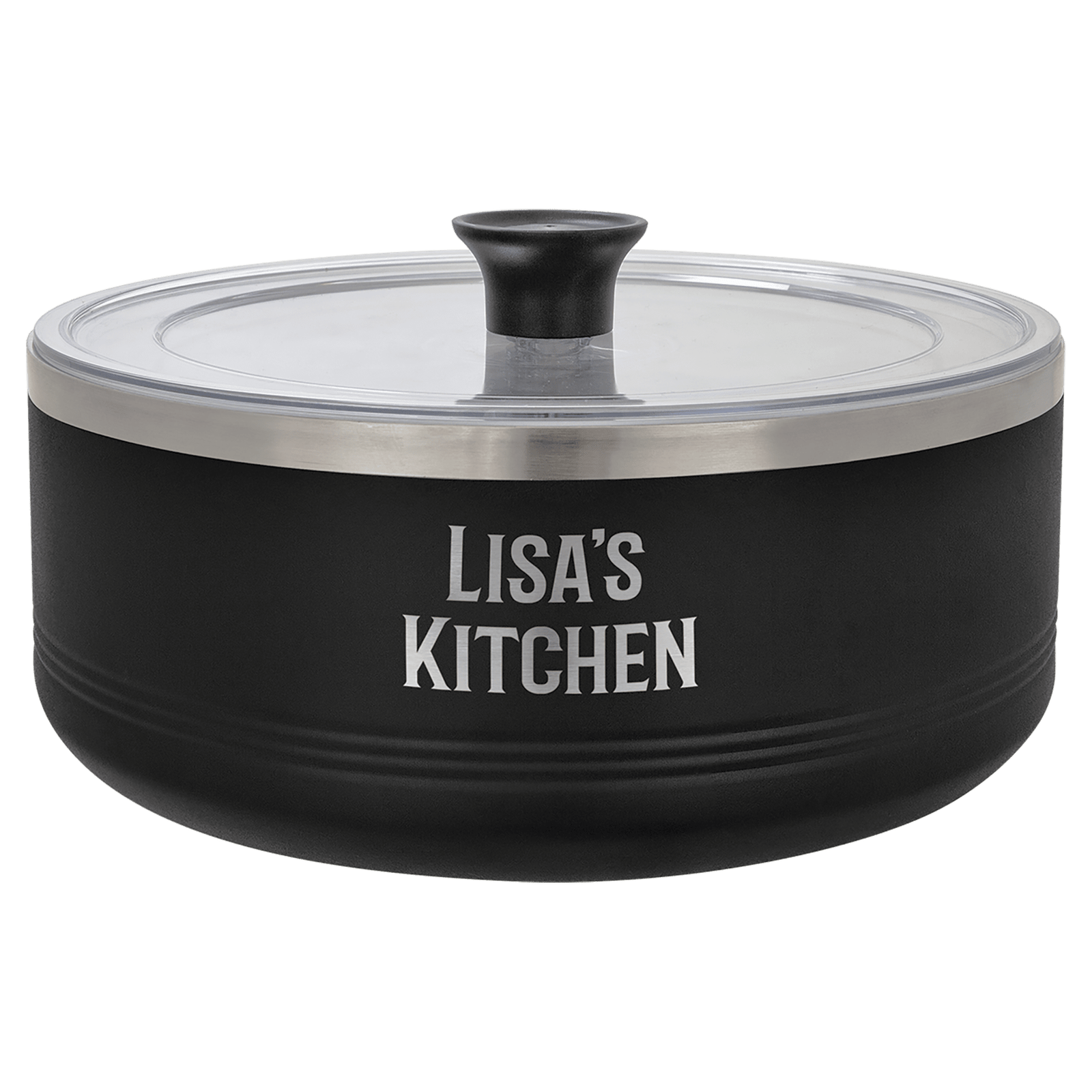 The double-wall, vacuum-insulated bowl keeps food hot or cold for potlucks,holiday parties, or any gathering. It features a clear, snug fitting lid with a hook so it can be hung out of the way on the side of the bowl and non-skid grips on the bottom to prevent sliding and scratched counters. The powder-coated bowls can be personalized to be as unique as the recipes inside and make great gifts or incentives. An optional insert allows for full-color seasonal decoration or an extra pop of color!